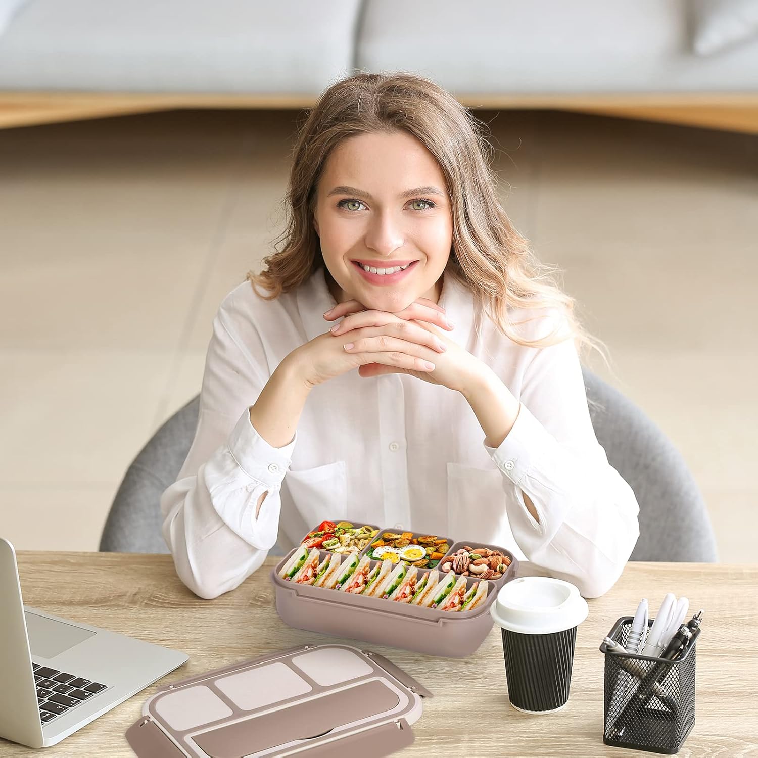 Bento Box Adult Lunch Box, Containers for Adults Men Women with 4 Compartments, Lunchable Food Container with Utensils, Sauce Jar, Muffin Liners, 40 Oz/5 Cup, Microwave & Dishwasher Safe, Brown