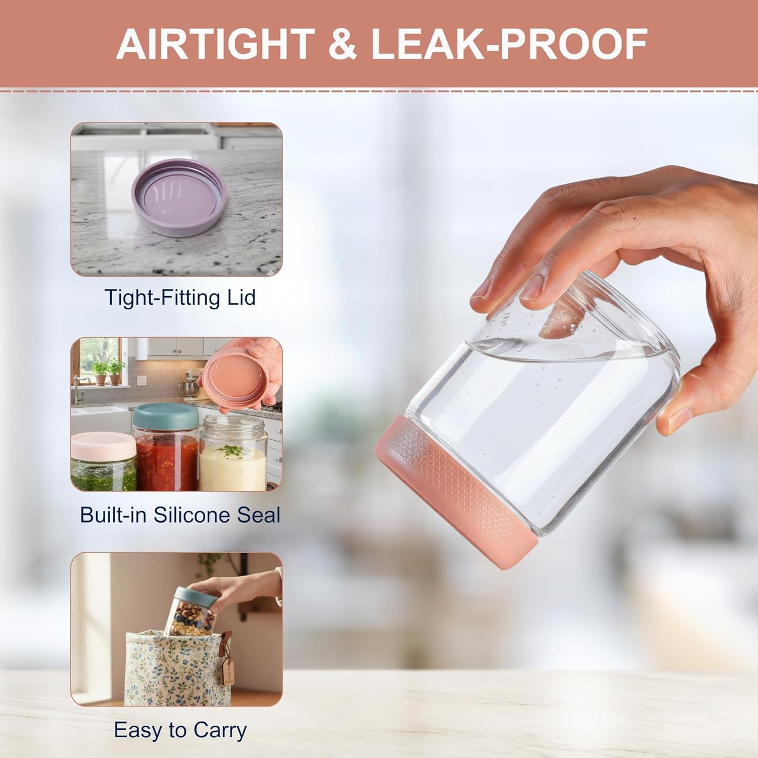 - AIRTIGHT LEAK-PROOF LIDS WITH SILICONE SEAL: Each lid features a silicone sealing ring and tight screw design, creating an airtight and leak-proof seal. Perfect for lunch prep, travel, or storing soups and dressings—no spills, no mess, just freshness every time.