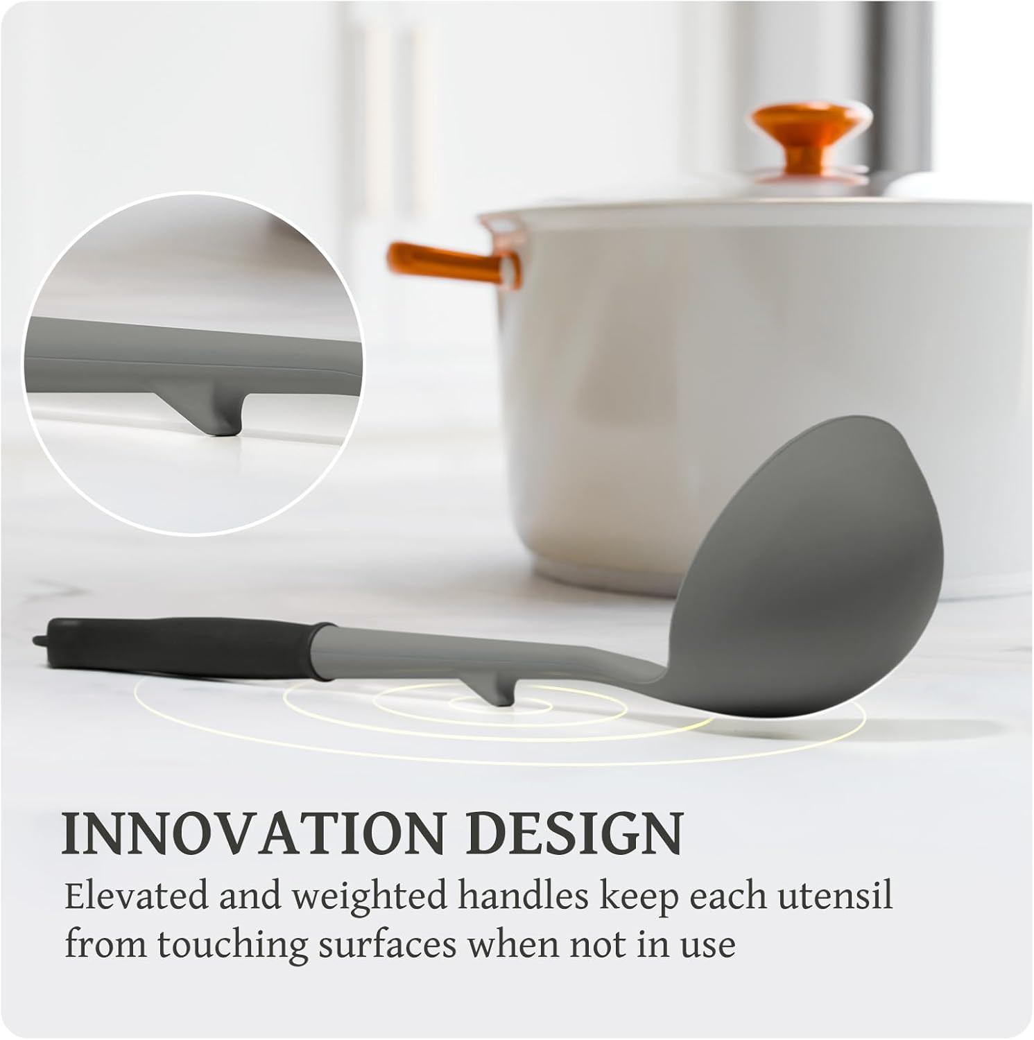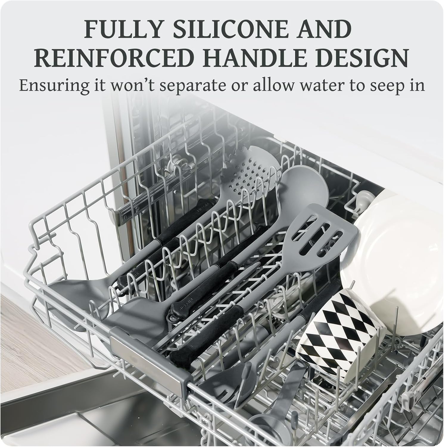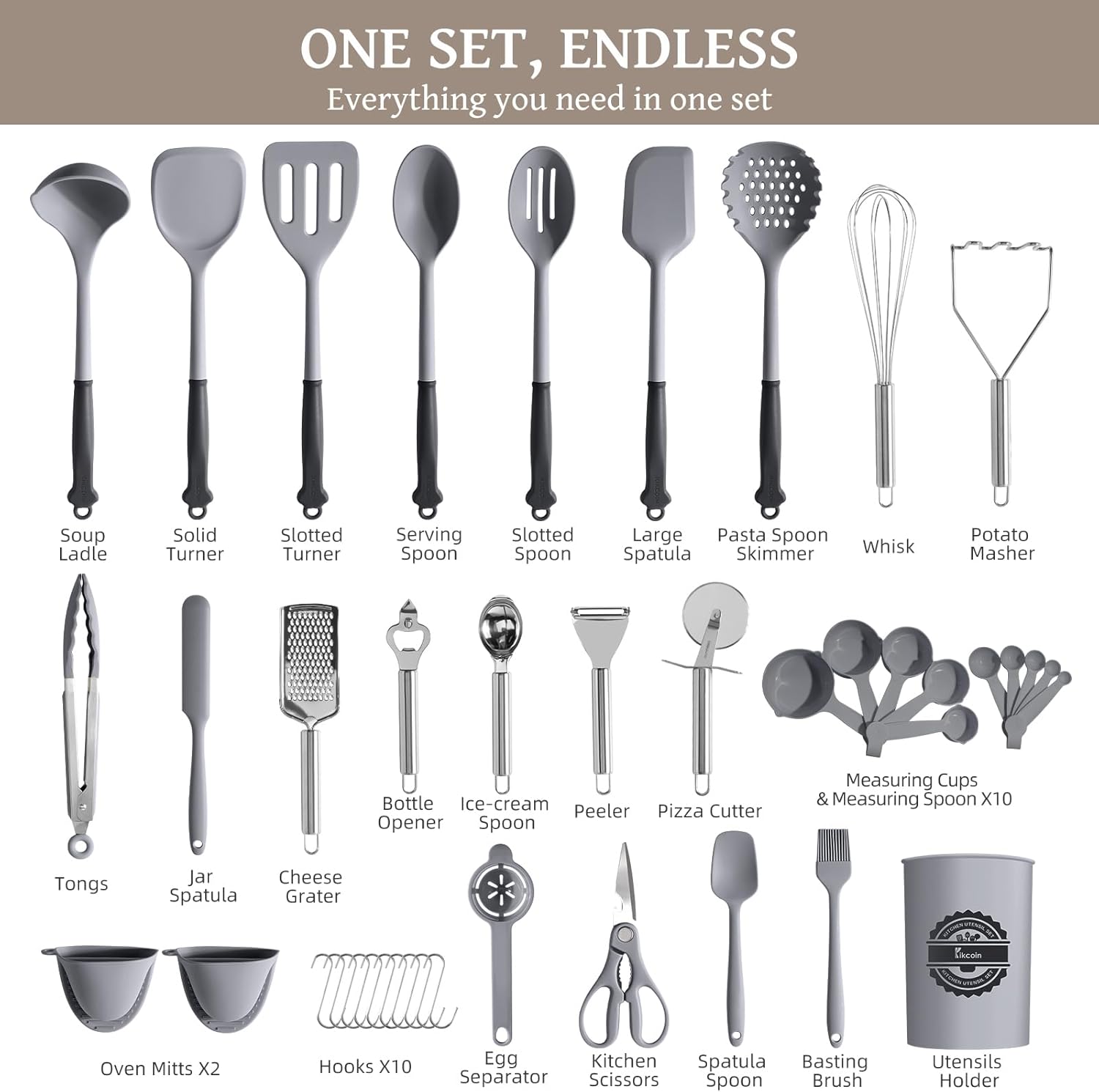 Kikcoin 43Pcs Large Kitchen Utensils Set - Silicone Cooking Utensils Set, Dishwasher Safe Spatula Set for Non-stick Cookware, 446°F Heat Resistant Kitchen Utensils Set with Holder BPA Free, Grey
