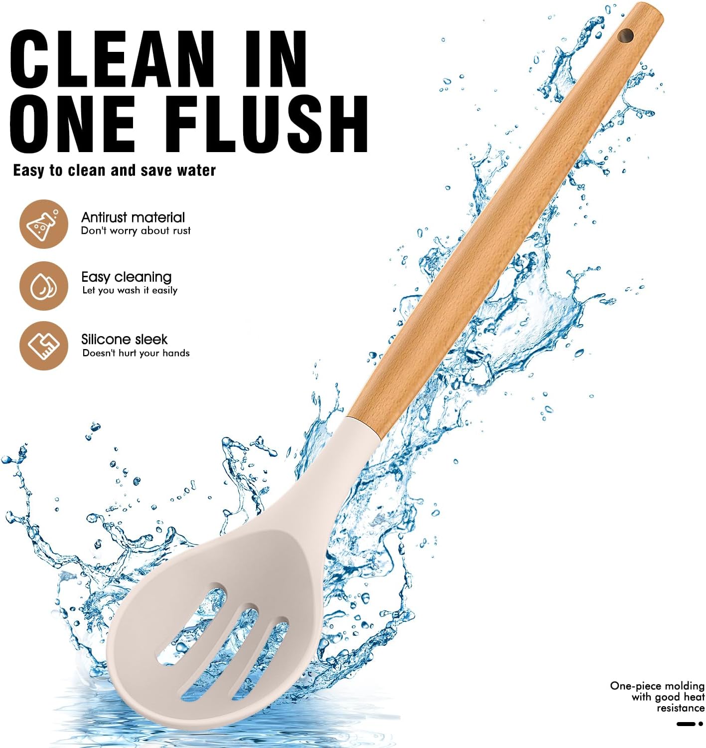 Silicone Cooking Utensils Set - AVGPD Silicone Kitchen Utensils for Cooking Wooden Handles, 446°F Heat Resistant Kitchen Utensil Spatula Sets w Holder, Gadgets for Non-Stick Cookware BPA FREE (Khaki)