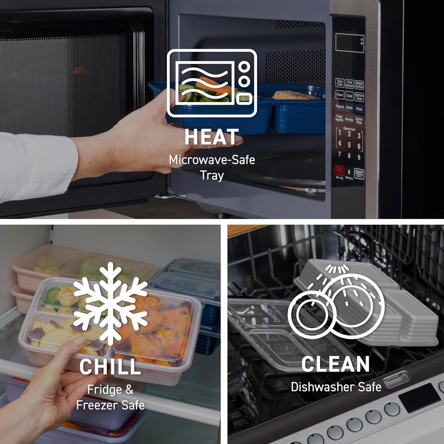 - Microwave, Freezer & Dishwasher Safe: Easy to heat, store, and clean! Safely reheat food from fridge or freezer—microwave trays only. Top-shelf dishwasher safe for hassle-free cleanup; hand-wash lids for best results.