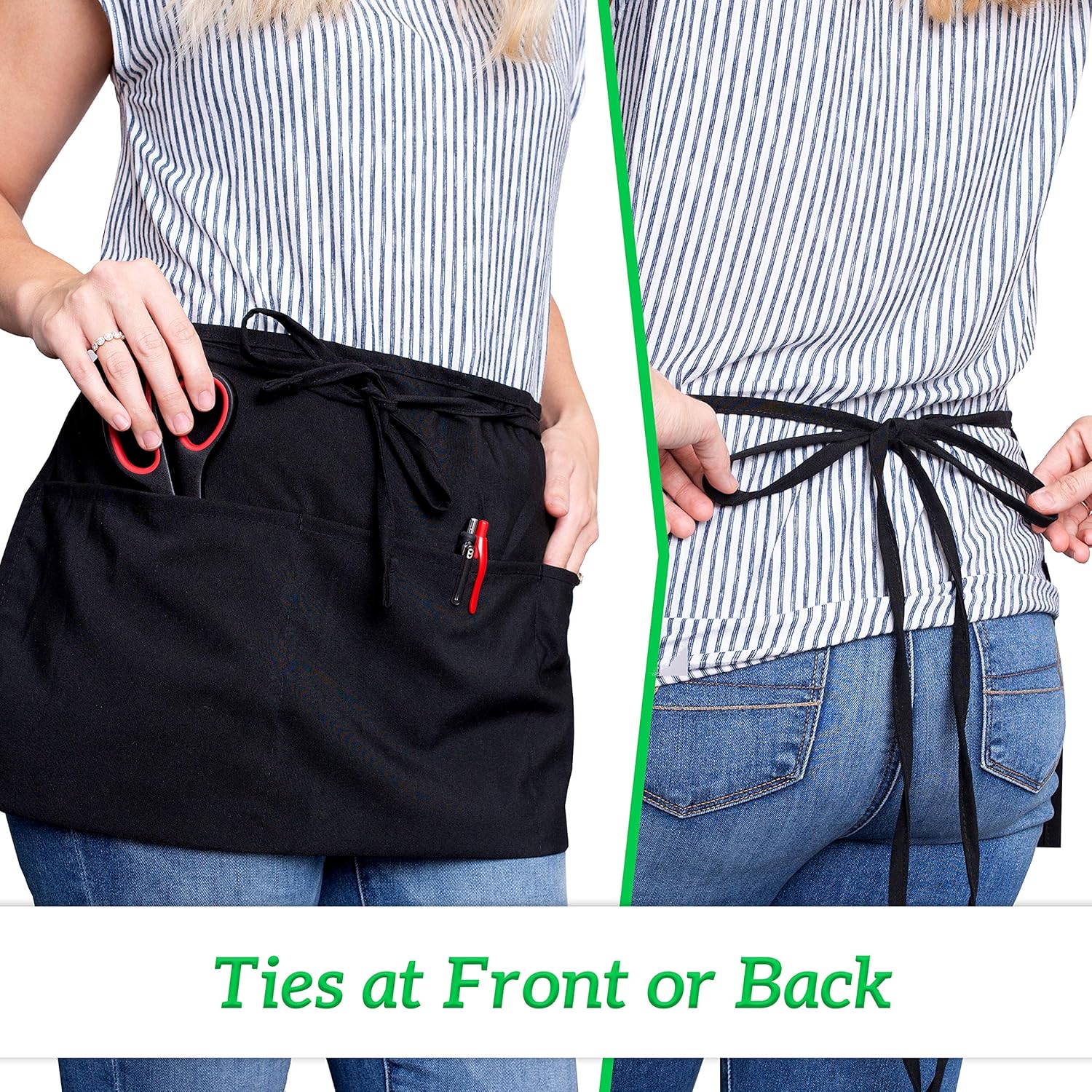 - 12 Pack Black Waist Aprons For Men And Women: The GREEN LIFESTYLE half apron for waiters and waitresses is made of commercial grade 100% Spun Polyester fabric to offer a durable, tough, tear-resistant and stain-resistant surface. Each aprons with pockets is specifically made to meet industrial grade standards so it is made to last and Machine Washable and will last you!