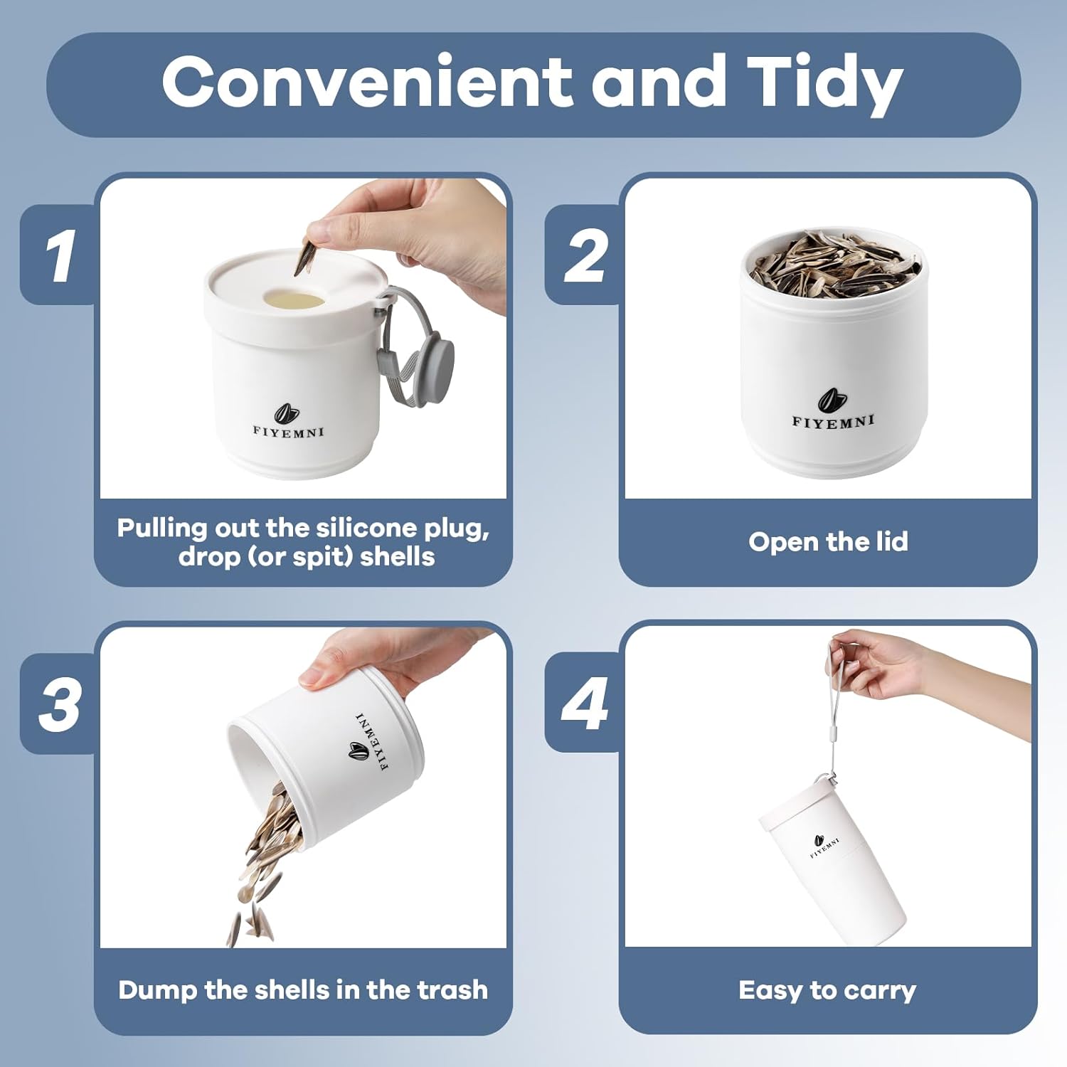- [Make Snacking Easier] Enjoying sunflower seeds? But how to dispose of the shell? The FIYEMNI Portable Sunflower Seed Cup solves that problem! With its 2-in-1 design for seed organizer and shell storage, it makes snacking on-the-go convenient and tidy
