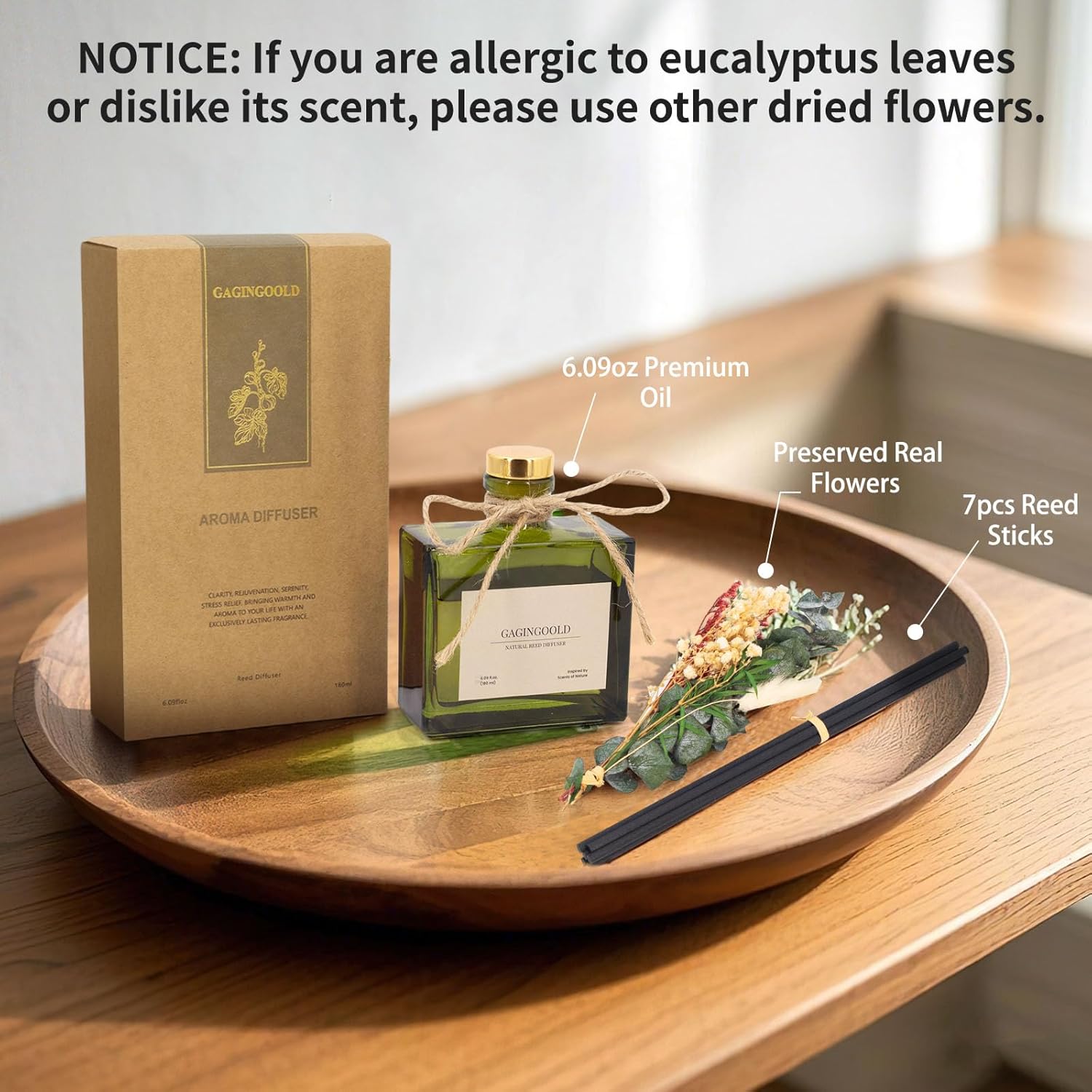 - Important Note: Contains real dried eucalyptus leaves and dried flowers . Please use other included dried flowers if you have an eucalyptus allergy or dislike its scent.