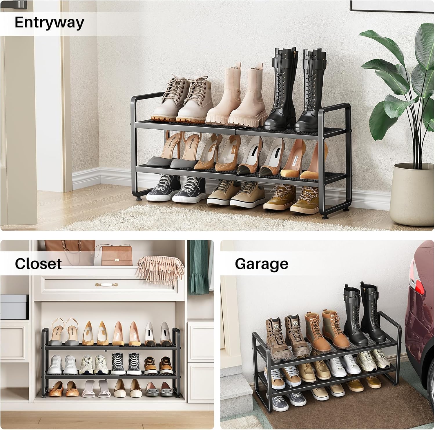 - Height Adjustable and Stackable: You can adjust the height of the shoe stand to fit taller boots as per your needs. Meanwhile, the shoe organzier can be purchased more to stacke into 4-tier, 6-tier, 8-tier and even 10-tier to maximize the vertical space.
