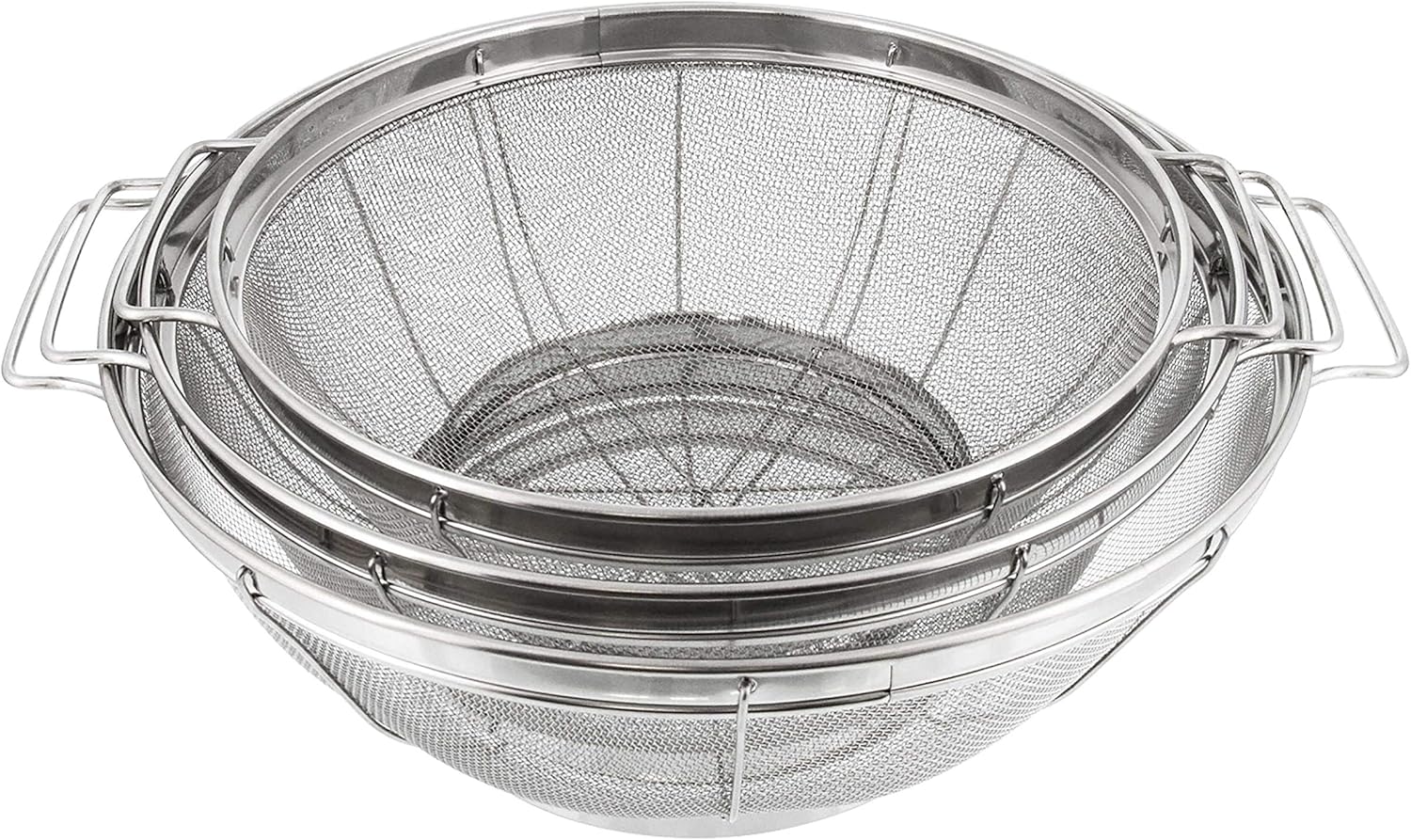 - Set of 3 Colander Baskets: Includes 3 sizes of premium, round stainless steel mesh colander net strainers with handles. They feature a sturdy wide-rimmed framework and a firm resting base on the bottom.