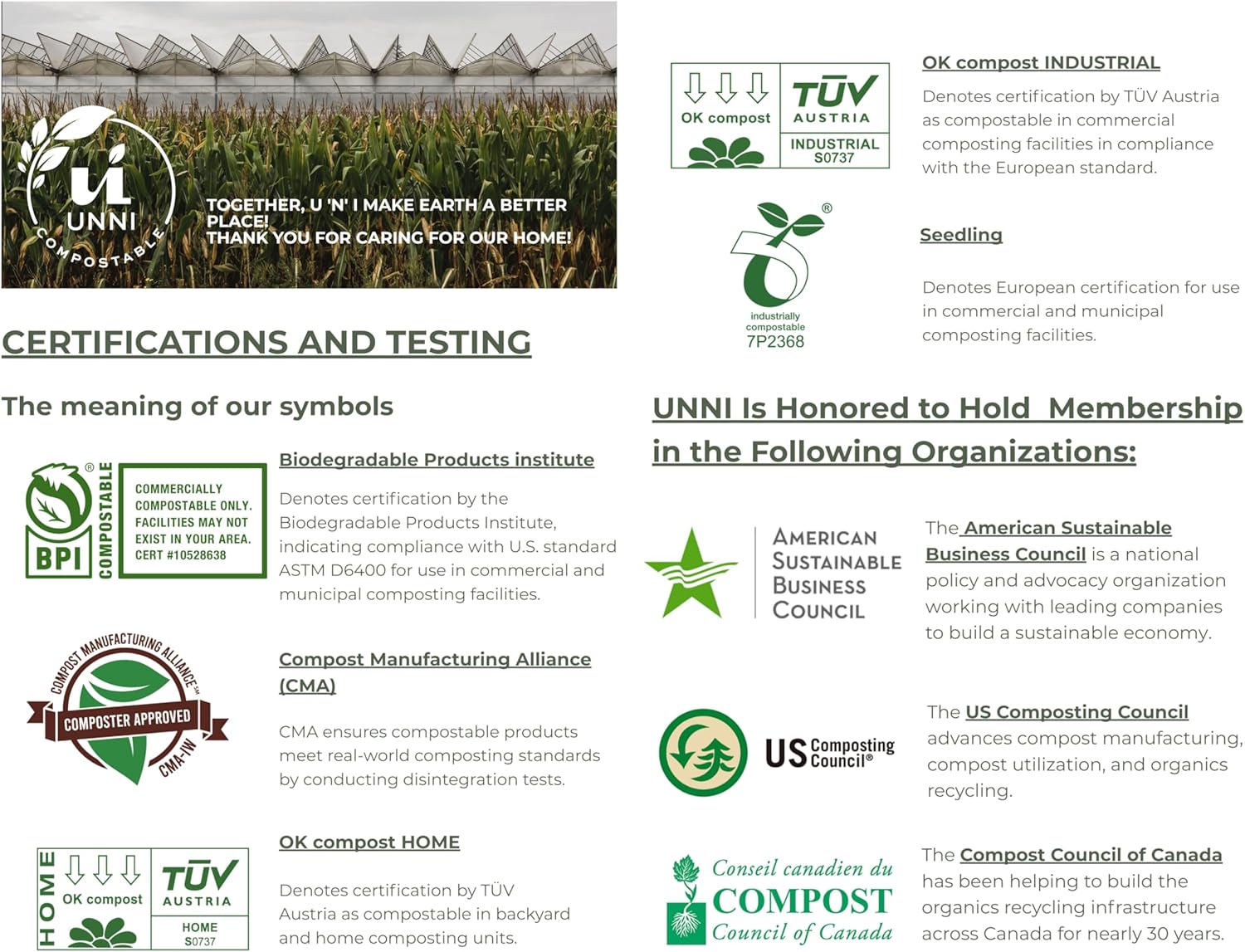 Certified Compostable: Independently certified by BPI (U.S., to ASTM D6400), CMA (field-tested in operating facilities), and OK compost HOME by TÜV AUSTRIA (home/backyard).