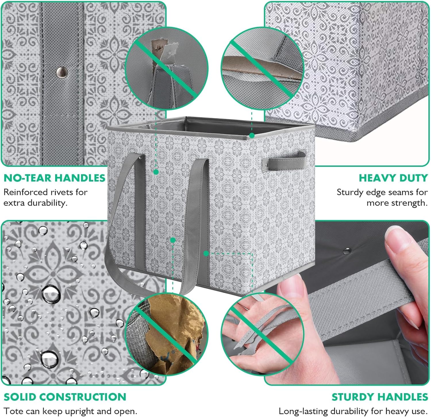 - Rigid Structure: The eco reusable grocery box is made of heavy-duty non-woven floral fabric (with water resistant coating) reinforced and stiffened with long lasting recycled cardboard insert on each side offering a rigid structure when opened.